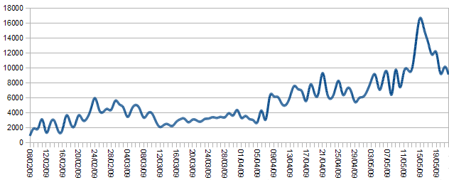 Che i miglioramenti introdotti abbiano dato i loro effetti è chiaro dal grafico qui sotto: se dal 8 Febbraio al 7 Aprile la media delle reicerche è di 3358 al giorno, nel periodo seguente, fino al 13 Maggio, la media è di 7251 ricerche al giorno. Il numero di ricerche è aumentato, in media, del 115%: un risultato eccezionale se teniamo conto del fatto che le ricerche erano già aumentate molto nel periodo antecedente.