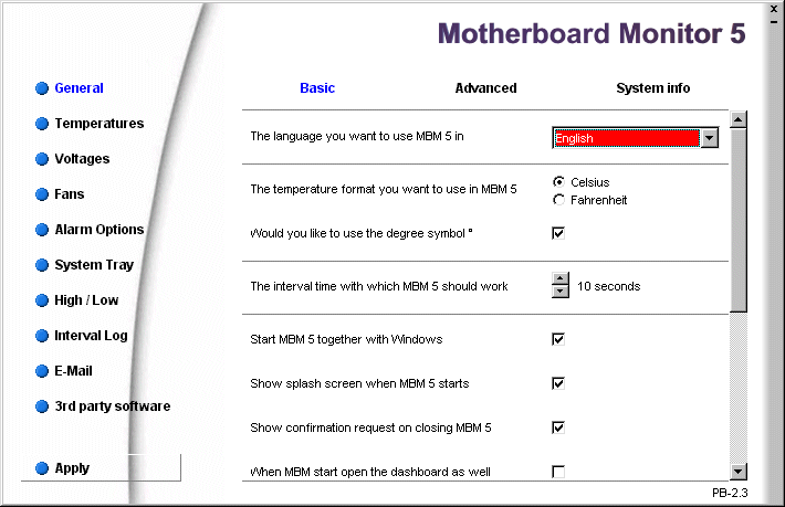 Considerati i consumi e di conseguenza il calore emesso dagli ultimi modelli di CPU, schede madri, memorie e hard disk, diventa fondamentale controllare la componentistica interna con un programma che non sia un semplice visualizzatore, ma un potente strumento di diagnosi e cura del proprio computer.A differenza delle comuni utility di verifica delle temperature fini a loro stesse, MBM introduce una serie di funzioni importantissime, quali avvertimento via e-mail, spegnimento del PC od altri eventi preimpostati ogni qualvolta uno o più parametri escano dal range consentito di valori.