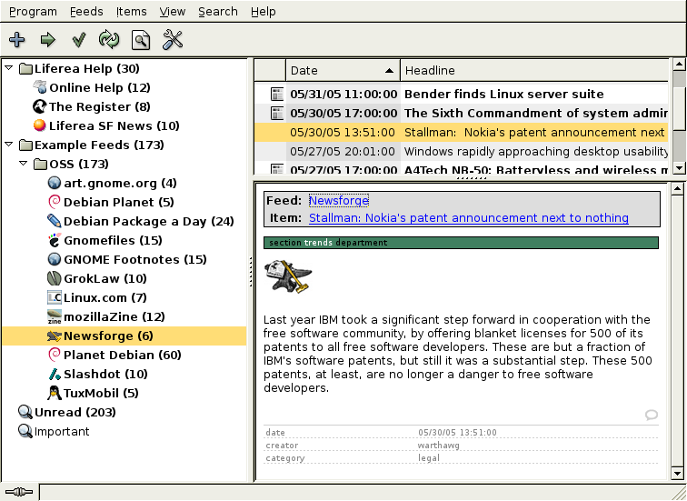 Liferea è un ottimo feed reader stand-alone per linux, in grado di leggere feed in formato RDF/RSS, CDF, Atom/Echo/PIE 0.2, OPML 1.0 e OCS 0.4.L'interfaccia assomiglia molto a quella tipica dei client per e-mail e newsgroup, e pertanto la navigazione tra i vari feed e tra i post al loro interno è molto intuitiva.