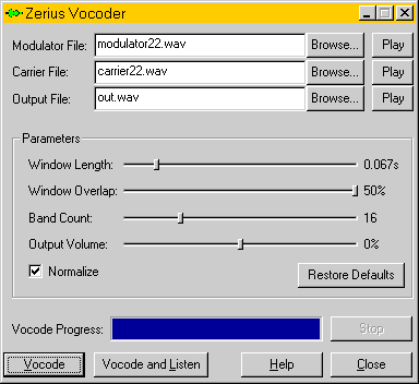 Il programma funziona a procedimento, ovvero inserendo i due files audio di modulation (effetto) e carrier (voce) per ottenere un terzo file come risultato.