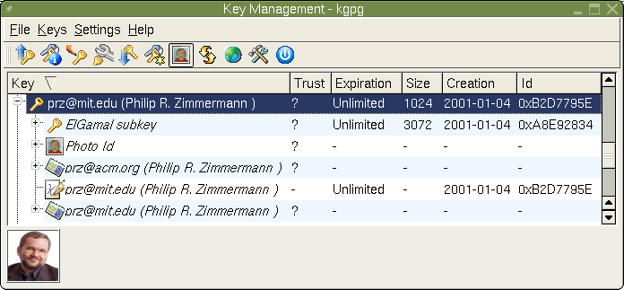 KGpg, acronimo di KG Privacy Guard, è un front-end (interfaccia grafica) al programma da riga di comando gnupg.Non serve ricordare l'innumerevole elenco per il programma gpg, KGpg farà tutto in modo trasparente.