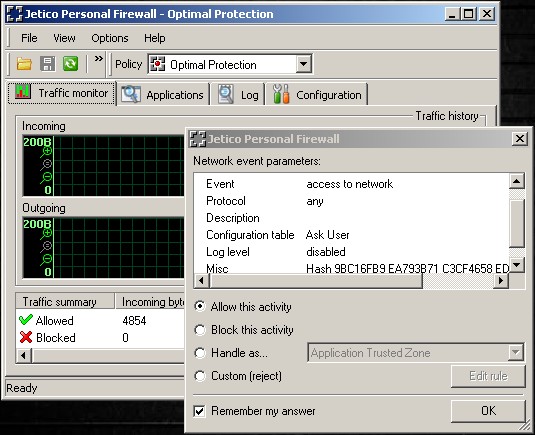 Come ogni firewall, Jetico si occupa di monitorare le applicazioni che accedono alla rete, così come tutti i pacchetti e gli eventi.