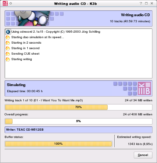 K3b è un programma che si interfaccia a cdrdao e cdrecord per la masterizzazione su sistemi GNU/Linux. L' interfaccia grafica è senza dubbio la più accattivante del settore, basandosi sulle librerie QT e ricalcando dunque lo stile del noto KDE. Il tutto a discapito però della leggerezza, che lo penalizza su macchine non di ultimissima generazione.Avendo a disposizione le librerie ed i software opzionali elencati qui e qui è possibile rippare e comprimere DVD in MPEG, file Ogg Vorbis, creare Video CD o CD bootabili e normalizzare le traccie dei CD audio.