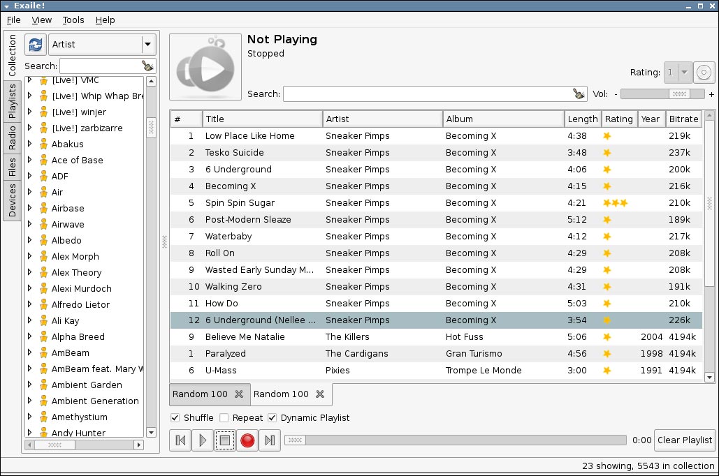 Se siete alla ricerca di un player audio completo per Gnome, allora Exaile è la soluzione per voi. E' scritto in python e per molte caratteristiche ricorda il player Amarok per Kde, come la vista a tab, il download automatico delle copertine e dei testi e il supporto a last.fm. Include anche una serie di plugin per gestire alcune componenti esterne, come il trasferimento di file su lettori multimediali (ipod), e include un browser interno per SHOUTcast.Vantaggi: