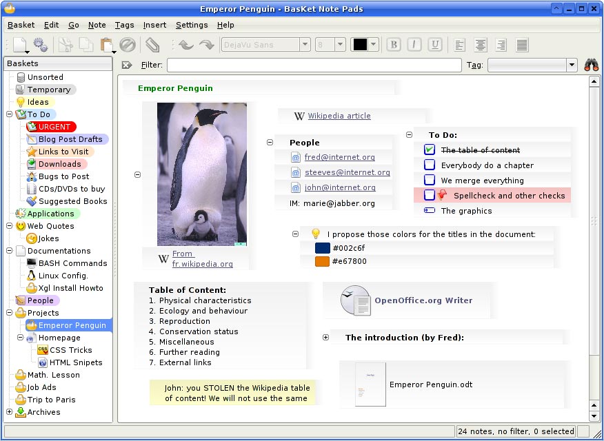 BasKet è un software per la gestione delle note e degli appunti. Sì, la k indica che è un applicativo per kde, e come tale, appena aperto, ci si trova di fronte un'interfaccia piena di menu, funzionalità e animazioni.E' programma molto versatile, è possibile inserire note di qualsiasi tipo, testo, immagini, link..., in qualsiasi punto di un documento o di una pagina. Per ogni appunto, basket permette sia la modifica singola (dimensioni, testo...), o anche di raggruparle in un unico insieme, e di aggiungere delle etichette predefinite o personalizzate.
