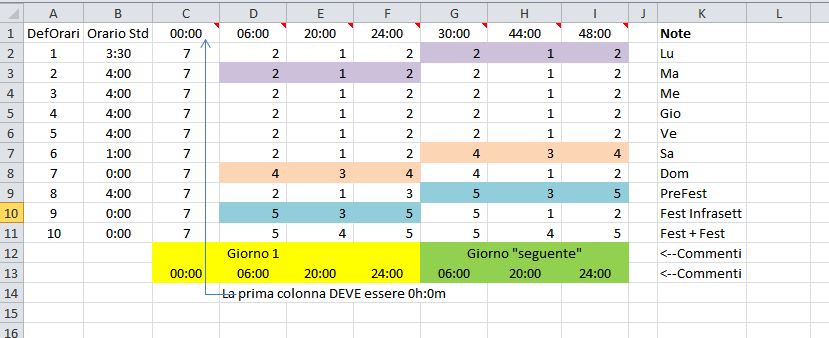 La cella iniziale (A1 nell'esempio) deve contenere la stringa DefOrari