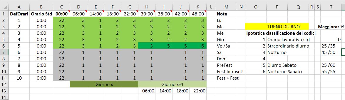 Ad esempio, alle ore del codice 1 (diurno 6-22), se relative a una giornata con orario Diurno, vanno sottratte le ore di lavoro standard, e alle rimanenti va applicata la maggiorazione 25% (prime 2 ore) e 35% le rimanenti.