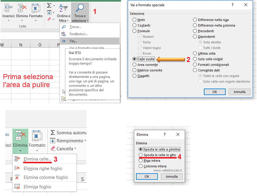 Salve, ho un file di excel con circa 60000 indirizzi email, ma ogni tanto ci sono delle righe vuote. Siccome devo assolutamente eliminarle (devo importare il file in un software che non ammette righe vuote, altrimenti mi da errore), volevo sapere se c'era un sistema per individuarle e poi eliminarle tutti in un colpo.