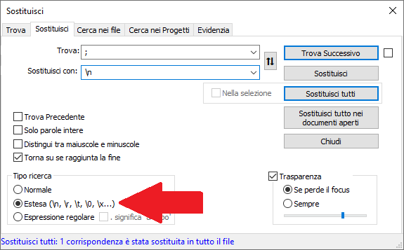 Ormai è fatta ma con il Notepad++ sarebbe bastato fare un "Sostituisci" con l'opzione "estesa" che vedi sotto