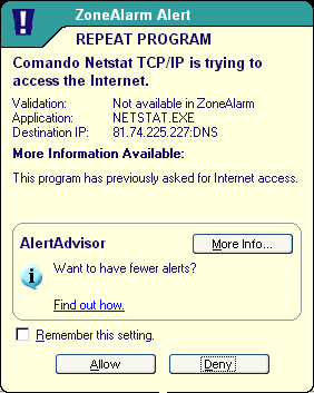 Intanto è un'impressione, perché Zone Alarm avvisa anche per un semplice ping e per molti altri futili motivi, e un po' perché la gente che è infetta da virus che tentano di porpagarsi è molta di più di quanto non si immagini... Durante le ondate di Blaster e Sasser o del worm di turno i tentativi si sprecano... Per non parlare di tutti quelli che si divertono ancora col Subseven o qualche altro trojan e sono alla ricerca di un computer infetto. Ma tutti questi casi non ci devono preoccupare, abbiamo il nostro firewall ;)