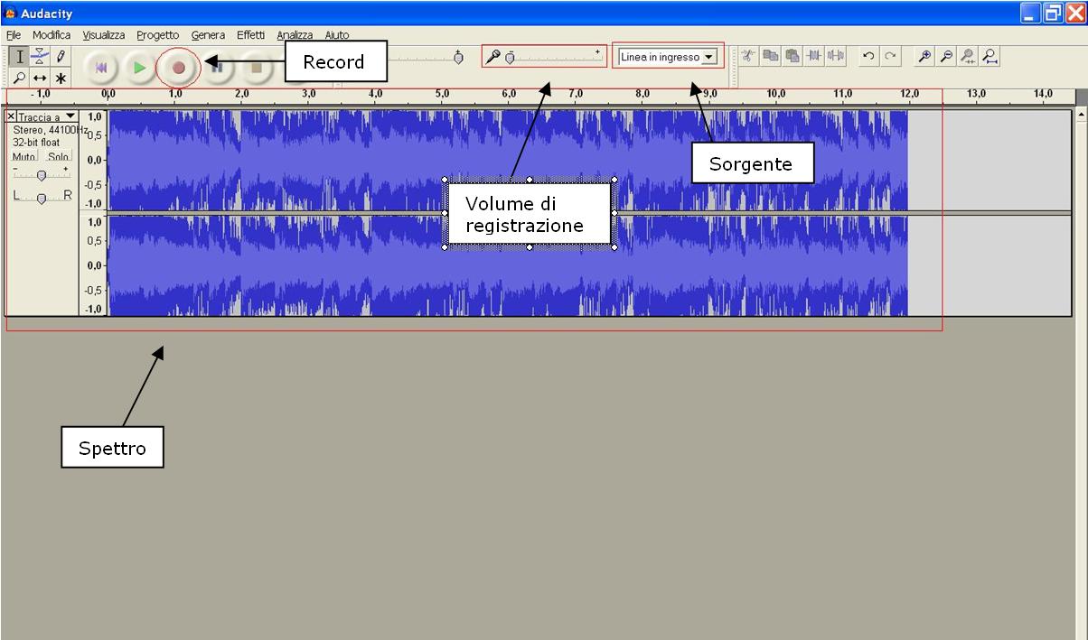 Controllare la figura per avere una panoramica di come si presenta la schermata di Audacity e di quali sono i controlli utilizzati.