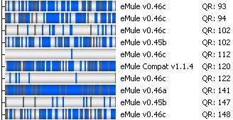 Facendo doppio click su ogni download possiamo vedere gli utenti da cui stiamo scaricando il file o in cui siamo in coda. I frammenti di file che vediamo in Blu sono quelli utili e disponibili per il download, quelli in grigio scuro sono quelli che abbiamo già scaricato e quindi che non ci servono.