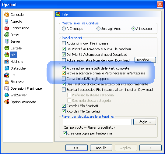 PREMESSA: se non conoscete il significato di qualche parola consultate il nostro Glossario.eMule è in grado di darci un’anteprima del file che stiamo scaricando. Per visualizzare l’anteprima di un download in corso bisogna andare sulla voce Trasferimenti, scegliere il file di cui vogliamo vedere l’anteprima, premerci sopra col tasto destro del mouse e scegliere la voce “Anteprima”. A volte però questa funzione è disattivata e non disponibile, questo probabilmente perché il file in questione non ha ancora l’head, presente nei primi frammenti di ogni file. Dovremmo quindi attendere che vengano scaricati i frammenti del file contenenti l’head prima di avere un’anteprima. Possiamo però settare eMule affinché dia precedenza ai frammenti contenenti l’head in modo tale da accelerare la disponibilità della funzione di anteprima. Questo è possibile scegliendo la voce opzioni > file e mettendo la spunta alla voce "Prova a scaricare prima le parti necessarie all’anteprima".