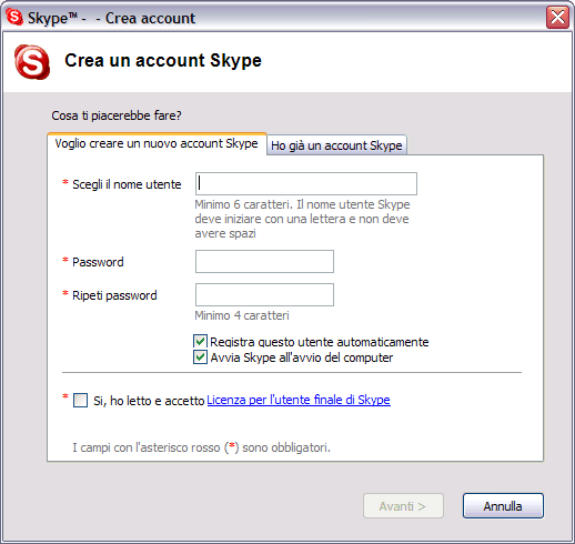 Una volta terminata l'installazione del software, è necessario procedere alla creazione di un account Skype (analogamente a quanto avviene con i ben noti softwares di messaggistica immediata come MSN e Yahoo).
