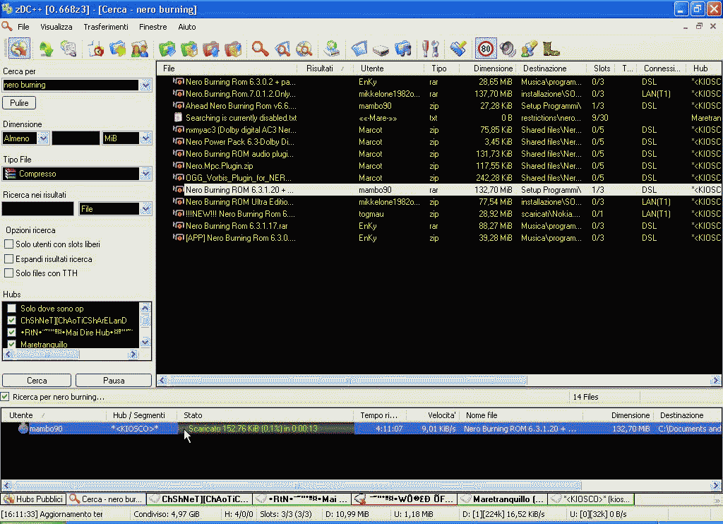 Facciamo un altro esempio. Supponiamo di voler cercare un programma, allora dalla casella "cerca per" scriviamo il nome del programma. Poi scegliamo come tipo di file "compresso" e selezioniamo gli hubs a cui siamo connessi. Adesso dopo aver cliccato su "cerca" dovrebbe comparire una finestra simile