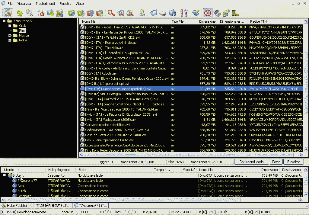 E' buona norma chiedere prima pubblicamente se è possibile inviargli un messaggio pvt. Oltre a questa opzione potete richiedere la lista dei files condivisi all'utente, vi basta cliccare col destro sul nick e scegliere la voce scarica lista files. Una volta scaricata si apre una nuova finestra cliccate su una cartella che vi interessa e vedrete il contenuto. Ora se un file vi piace vi basta cliccare col destro del mouse su di esso e scegliere la voce "download", in questo modo inizierà lo scaricamento nella cartella impostata da voi durante la configurazione. Se invece volete specificare una cartella diversa allora cliccate sulla voce "scarica su" e scegliete il percorso su windows. Fatto ciò in basso al programma dovreste vedere la scritta connessione in corso...Se per caso in quel momento l'utente non ha slot liberi per noi uscirà la scritta not slot available e dovremmo ritentare in seguito (non cancellatelo dalla finestra), il programma tenterà la connessione. Se un file è disponibile oltre che presso quell'utente anche presso altre fonti comparirà così. Come vedete il file è disponibile da 6 fonti ed il pc sta tentando la connessione ad ognuno di essi. Come vedete per ogni utente si apre un pannello che vedete nella barra di stato (nel mio caso 77neurone). Per chiudere la connessione presso l'utente basta cliccare su di esso e scegliere la voce "chiudi connessione". Se, come nel mio esempio, il file è disponibile presso più utenti, allora la voce da scegliere sarà "disconnetti tutti gli utenti". Per rimuovere completamente una operazione dalla finestra vi basta cliccare su di esso e scegliere la voce "rimuovi " e confermare nella finestra successiva.