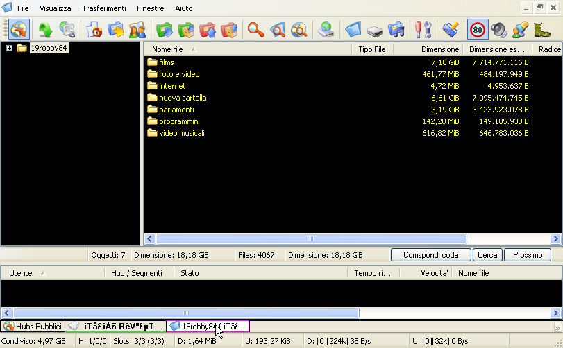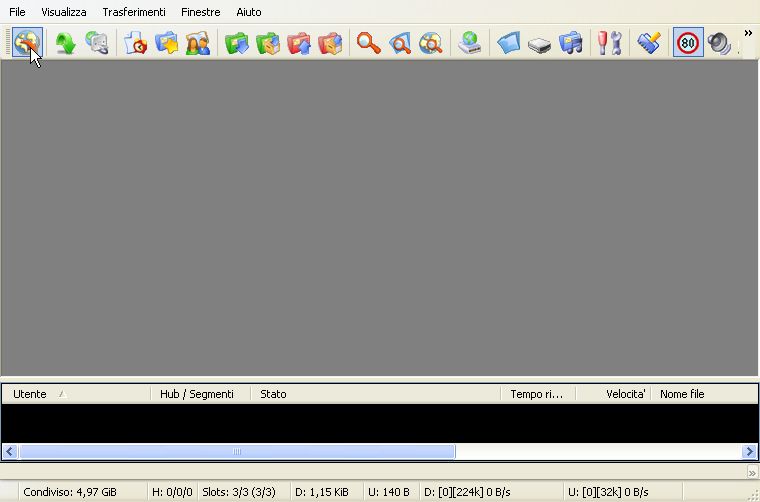 Ovviamente se cerchiamo materiale italiano dovremmo connetterci ad uno di essi con la bandiera della nostra nazione. Nella colonna descrizione c'è una piccola descrizione dell'hub. E' importante analizzare la colonna Min share, perchè la dimensione indicata in questa colonna indica il minimo di files condivisi per entrare. E' utile quindi per trovare materiale italiano connettersi ad un hub italiano e con molti utenti. La quantità condivisa da voi se non la ricordate la potete vedere nella barra di stato del programma in basso dove dice Condiviso.