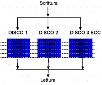 Raid 2: ogni operazione (lettura e scrittura) si distribuisce tra tutti i dischi. Il disco ECC registra informazioni di fault tolerance.