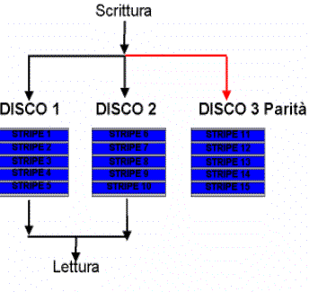 RAID 3. E' simile al RAID 2, solo che invece di avere più unità che gestiscono informazioni ECC, troviamo un solo drive che registra bit di parità. Se un disco si guasta gli stripe mancanti possono essere ripristinati calcolando lo XOR (informazioni di parità) di stripes posizionati in modo uguale sugli altri dischi, ripristinando il dato perduto.Per poter ottenere questa funzionalità è necessario che i dati registrati si smistino tra tutti i dischi nell'array in modo da avere un transfer di parti di ciascun record in parallelo, massimizzando la velocità. Comunque dato che la dimensione degli stripes deve essere piccola, più piccola di un record tipico, dovrebbero essere potenziate le richieste di lunghi dati sequenziali se non fosse che il continuo accesso parallelo ai dischi rallenti le operazioni; inoltre RAID 3 permette solo un'operazione di I/O ala volta, limitante per ambiente Workgroups con molti utenti.