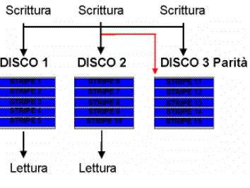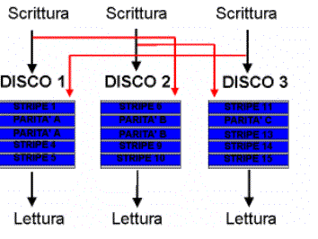 RAID 5. Con una tecnica definita parità distribuita, il RAID 5 supera le limitazioni imposte al RAID 4 dal singolo drive destinato alla parità, dedicandone in ogni disco dei settori. Il totale dello spazio distribuito tra i dischi dedicato alla parità è uguale a quello di un singolo drive intero, permettendo che molteplici operazioni di scrittura avvengano simultaneamente, così come le letture. Un leggero delay risulta dall'update della parità. Inoltre gli stripes possono essere definiti in dimensione,adattando l'array all'ambiente di lavoro.