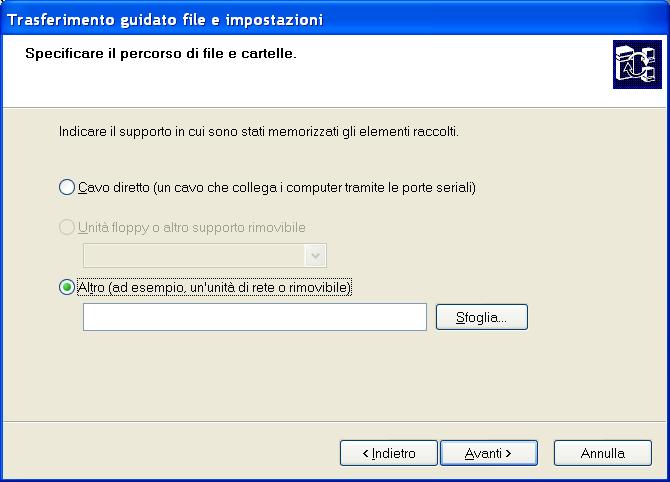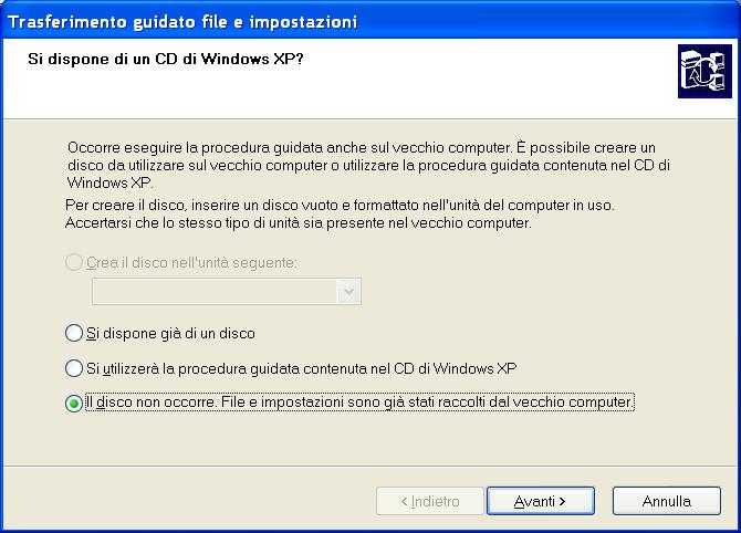Selezioniamo Il disco non occorre. File e le impostazioni sono già stati raccolti dal vecchio computer e premiamo Avanti; ora dobbiamo dire alla procedura di andare a prendere i file che abbiamo salvato