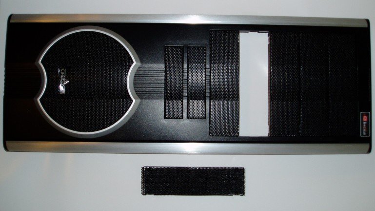 Direttamente presenta il tasto di accensione e scendendo sette frontalini (cinque dietro cui alloggiare dispositivi da 5.25'' e due per dispositivi da 3.5'') tutti traforati e muniti di filtro antipolvere; poco più sotto è presente la griglia di ingresso dell'aria protetta anch'essa da filtro antipolvere ove è posizionata al suo interno una ventola da 12 cm munita di luce a led blu.