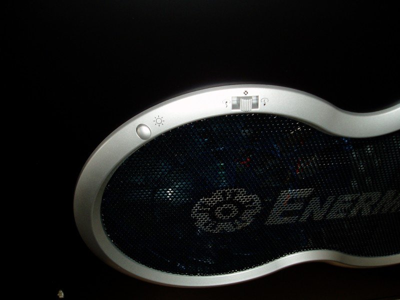 Sul lato sinistro appaiono evidenti i due alloggiamenti per altrettante ventole. E' già presente una ventola da 25 cm munita di luce a led blu escludibile. Infatti, nella cornice, è presente il pulsante di accensione / spegnimento della luce della ventola unitamente ad un pulsante che permette di controllare la rotazione della stessa: attingere aria dall'esterno, espellere aria all'esterno, ventola spenta.