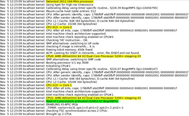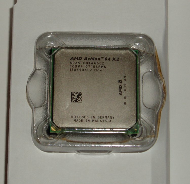 Sulla parte superiore del processore sono stampigliati alcuni codici tra cui 'ada5200iaa6cz' che identifica esattamente la tipologia della CPU in visione; in particolare 'ada' indica gli AMD Athlon 64 Desktop, '5200' il rating della CPU secondo gli standard AMD, 'i' il package, 'aa' rispettivamente tensione operativa variabile (intorno a 1,3 – 1,35 V) e temperatura operativa variabile (55 – 70°C), '6' cache di secondo livello da 2 MByte ovvero 1MB x 2, infine 'cz' che è la part definition ovvero lo stepping produttivo. Da aggiungere come nota che la cache di primo livello è da 128 KByte ovvero 64KB x 2. Alcune caratteristiche posso essere individuate leggendo anche i messaggi del kernel di una distribuzione Linux come quelli che potrete vedere tra le fotografie sottostanti.