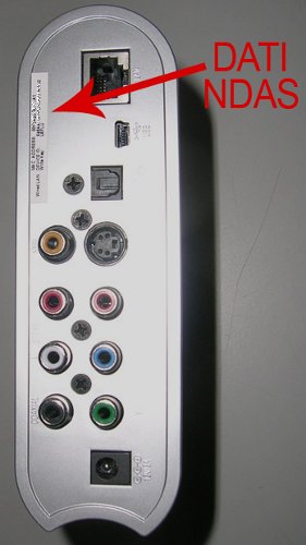 In effetti, poiché nessuna informazione viene fornita all’acquirente su dove reperire questo MAC address, dopo aver guardato sotto e sopra l’unità, al fondo del manuale, sulla scatola, dopo aver cercato l'esistenza di un eventuale “foglietto” aggiuntivo senza aver trovato nulla, ci siamo avventurati - previa una rapida ricerca effettuata in internet – alla caccia di questo valore, mediante l’utilizzo di un apposito tool (ndasscan, di cui bisogna reperire una certa e ben precisa versione dei driver NDAS, dopo aver ovviamente disinstallato quelli più recenti) sviluppato da un generoso quanto sconosciuto programmatore. Quando siamo riusciti a recuperare con successo questi dati, spostando per l’ennesima volta il disco mentre ne studiavamo la conformazione, abbiamo scoperto l’esistenza dell’adesivo incriminato. Fate ben attenzione: l’etichetta c’è! E’ minuscola, ma c’è!