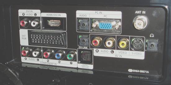 Sul retro sono presenti le innumerevoli porte di ingresso / uscita: HDMI, DVI IN, presa SCART, cinque prese audio/video per componenti DTV / DVD, uscita audio digitale (optical), RS232C per il servizio di assistenza, quattro prese per collegamento A/V esterni (due audio, un video, un S-video), presa per cuffie, due prese specifiche per PC (audio e D-sub). E' presente anche lo slot Kensington come antifurto per il prodotto.