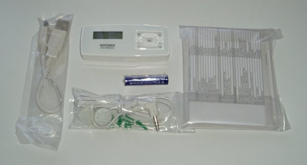La confezione contiene: un lettore MP3, un cd-rom di installazione per sistemi Win98, un auricolare, un cavo USB, una batteria AAA, manuale cartaceo in varie lingue tra cui italiano.