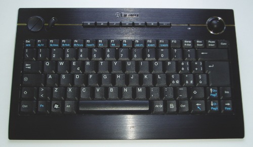 Nella parte superiore, oltre alla presenza dei tasti con esclusione del tastierino numerico, possiamo trovare a sinistra i due pulsanti del mouse seguiti dalla rotellina. Vi sono poi sette tasti rapidi: home page, posta, cerca, aumenta volume, diminuisci volume, zittisci, avvia / pausa. Abbiamo quindi un led rosso per indicare lo stato di esaurimento della batteria con a fianco una sfera, la trackball, ovvero il mouse.