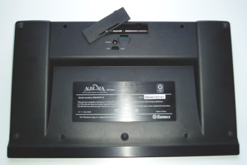 Nella parte inferiore troviamo il vano per le due batterie tipo AA (incluse nella confezione), il tasto di reset per sincronizzare la tastiera con il ricevitore, il tasto per accendere o spegnere il dispositivo. Da notare che la struttura presenta delle scanalature che permettono una facile impugnatura della tastiera, in modo da poterla utilizzare facilmente tenendola in mano.