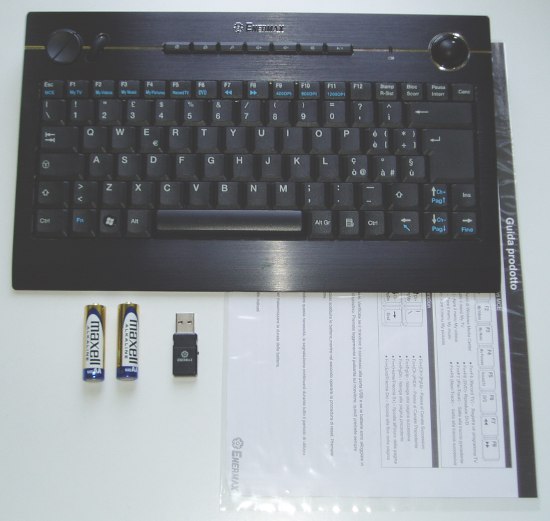 La confezione contiene: la tastiera, il ricevitore, due batterie AA, la guida rapida in italiano ed inglese.