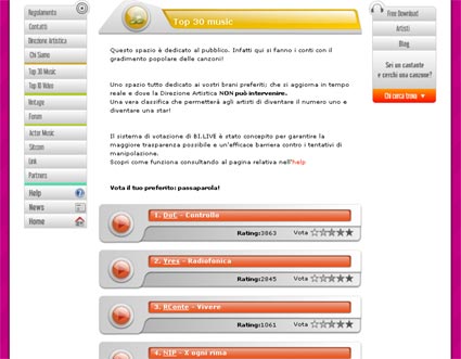 Questo interessante progetto, promosso da talent scout di successo, ti permette questo ed altro: puoi infatti caricare su Bilive.it il tuo brano di punta che verrà poi scaricato dal popolo del web; automaticamente si creerà una classifica dei più ascoltati e chissà la tua musica potrebbe piacere all'orecchio giusto...