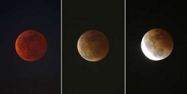 Verso le 22.00 abbiamo potuto assistere ad una prima fase parziale ma già molto suggestiva; poco dopo mezzanotte la totalità dell'eclisse è arrivata puntuale e la luna si è tinta di un rosso-rosa particolarmente suggestivo. Ma che vi racconto, le immagini parlano da sole: dove reperirle? Vi segnalo la raccolta di Yahoo News dalla quale ho estrapolato le seguenti tre foto.