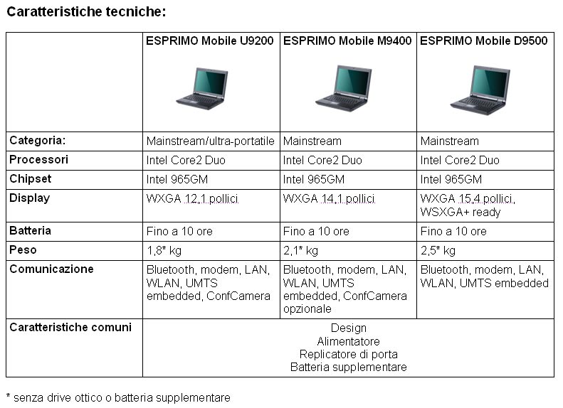 Fujitsu Siemens Computers presenta la nuova famiglia di notebook ESPRIMO Mobile. Disponibili da agosto 2007, la nuova linea di notebook professionali dispone di tre modelli dalle configurazioni avanzate: ESPRIMO Mobile U9200, ESPRIMO Mobile M9400 ed ESPRIMO Mobile D9500, tutti con replicatore di porta e batteria supplementare.