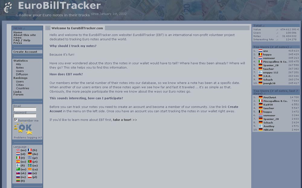 Eurobilltracker.com conta circa 100.000 utenti i quali cercano di "tracciare" il percorso seguito dalle loro banconote di Euro in tutto il mondo.