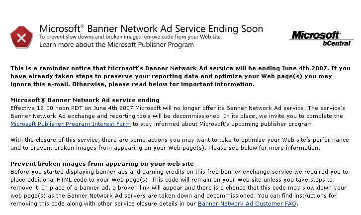Verso la fine del 2006 lo staff di Microsoft ha affermato che la loro storica directory Msn bCentral non avrebbe più accettato iscrizioni.
