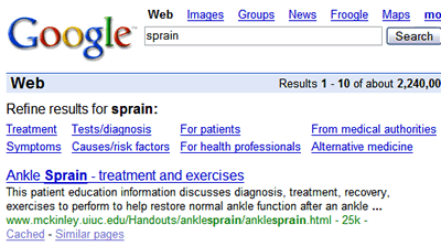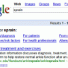 1) In primo luogo Google Co-op apparirà come opzione fornita al navigatore per raffinare la sua ricerca tra i risultati “normali” di Google. Ad esempio se si cerca un argomento (topic) correlato alla sfera della salute utilizzando la parola “sprain” (distorsione) si vedranno apparire diversi links aggiuntivi rispetto ai risultati tradizionali i quali trattano di “Trattamento e cura", "Diagnosi", "Sintomi" ecc.