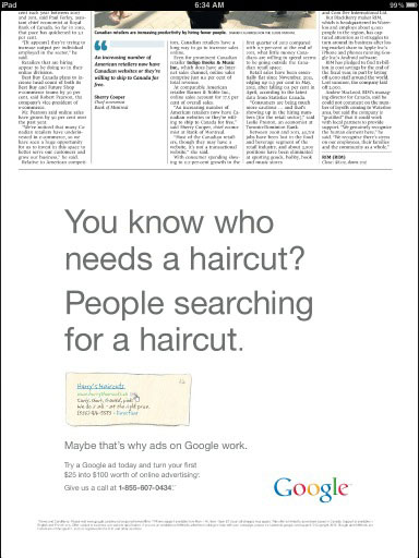 Questo annuncio potrebbe essere efficace nel raggiungere quei business che ancora non hanno una vera presenza su Internet, ma bisogna ammettere che, escluso il lato divertente e l'ironia della situazione, la scelta del tema è piuttosto strana. I barbieri e i parrucchieri sono scelti in base alla convenienza della loro posizione, in base al loro servizio e in base al passaparola: conoscete qualcuno che ha scelto dove tagliarsi i capelli via Internet (persone che viaggiano escluse)? A dire la verità, avete mai visto la pubblicità di un barbiere o di un parrucchiere su un qualsiasi quotidiano?