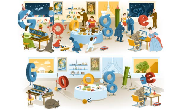 Google ha trovato il modo di celebrare il Capodanno con un doodle doppio, uno per il 31 Dicembre 2012 e uno per il 1° di Gennaio 2013. Mentre il primo mostra una festa, il secondo mostra la stanza senza i vari personaggi... e i personaggi sono la vera chicca di quest'anno perché ognuno di loro ha un significato molto speciale.