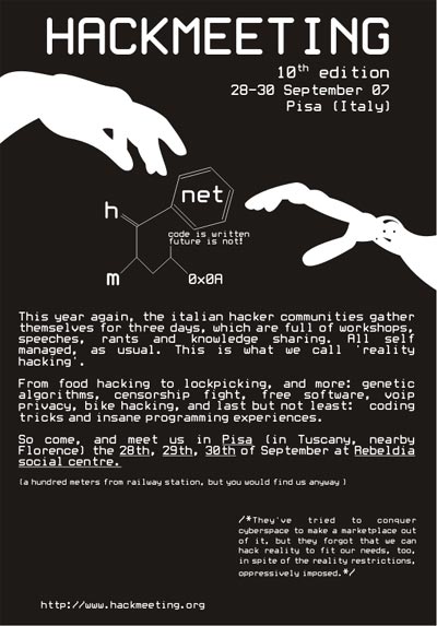 Si terrà a Pisa la 10° edizione dell'Hackit 2007, al centro sociale Rebeldia in via Battisti 51/633 a soli 5 minuti a piedi dalla Stazione Centrale di Pisa.