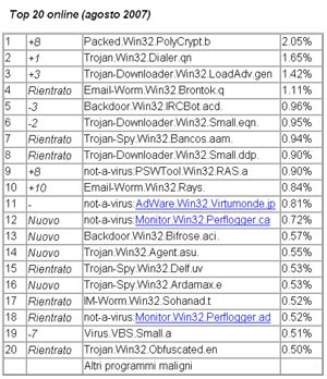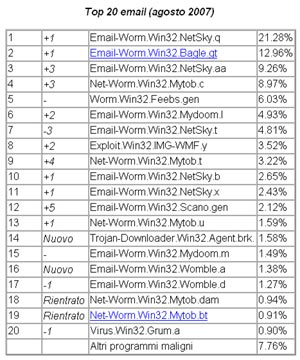 Kaspersky Lab presenta la Top 20 di agosto 2007 dei virus presenti in rete e di quelli che si diffondono attraverso la posta elettronica.