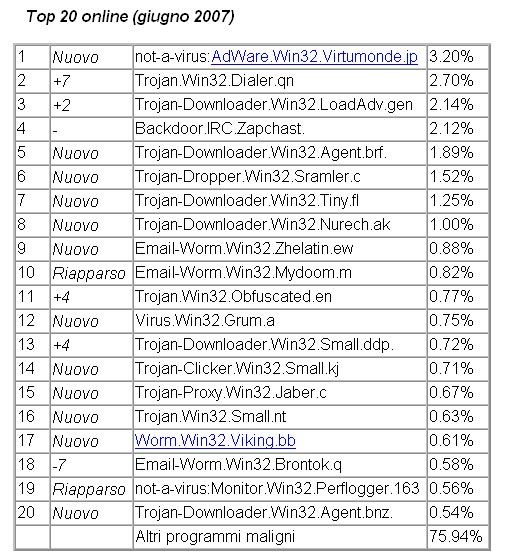 Kaspersky Lab presenta la Top 20 dei virus online e email di giugno 2007