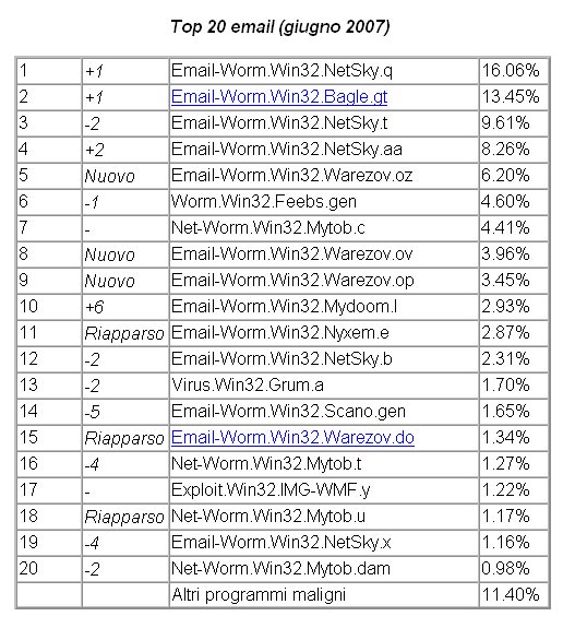 - In discesa: Email-Worm.Win32.NetSky.t, Worm.Win32.Feebs.gen, Email-Worm.Win32.NetSky.b, Virus.Win32.Grum.a, Email-Worm.Win32.Scano.gen, Net-Worm.Win32.Mytob.t, Email-Worm.Win32.NetSky.x, Net-Worm.Win32.Mytob.dam