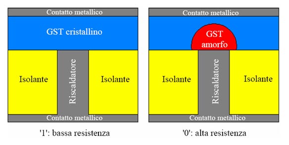 In figura è schematizzata la cella di memoria in corrispondenza dei due stati logici. Il materiale attivo è chiamato GST perché è appunto una lega di germanio (Ge) antimonio (SB) e titanio (Ti).