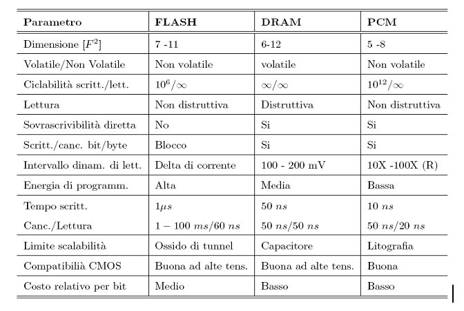 PCM: Phase Change Memory. Questi dispositivi di memoria sono realizzati sfruttando le particolari proprietà delle leghe calcogenure, formate da elementi del VI gruppo, detti calcogeni, assieme ad elementi del IV e V gruppo della tavola periodica. Tali materiali sono già stati utilizzati per realizzare dischi ottici a cambiamento di fase, quali CD e DVD riscrivibili. La loro peculiarità è quella di presentare una transizione tra due fasi, cristallina ed amorfa, aventi diverse caratteristiche elettriche, ottiche e termiche. In particolare, la fase cristallina è dotata di un basso valore di resistività, a differenza della fase amorfa la cui resistività elettrica è invece elevata. La possibilità di transire tra queste due fasi applicando opportuni impulsi elettrici agli elettrodi del dispositivo, unitamente ai diversi valori resistivi corrispondenti, consente così di immagazzinare il bit di informazione associando ad ogni fase del materiale un diverso stato logico della cella di memoria.