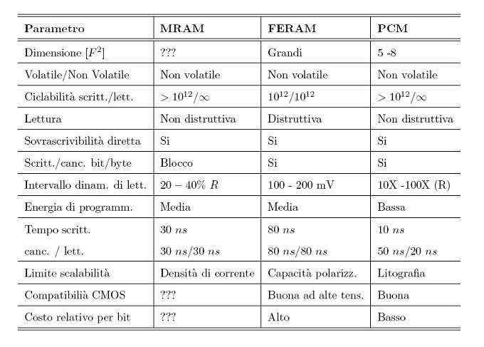 Le peculiari caratteristiche delle leghe calcogenure rendono quindi le memorie PCM in grado di porsi in competizione con tecnologie già ben consolidate, come la FLASH e la DRAM, e in fase di studio come le FERAM e le MRAM. Nelle successive due tabelle vengono posti a confronto i parametri fondamentali delle varie tecnologie.
