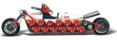 La moto si chiama Dolmette ed è la prima moto spinta da motoseghe (prima anche perchè ci vuole una mente contorta a pensare e poi realizzare una roba del genere…). La marca delle motoseghe è DOLMAR sono 24 e ovviamente si utilizza solo il motore e non la lama, cambio a 5 marce Harley-Davidson con una serie di 12 cinghie dentate per rilasciare una potenza totale di 125 kW e 170 cv a 10.000 giri al minutocon tutti i motori accesi.